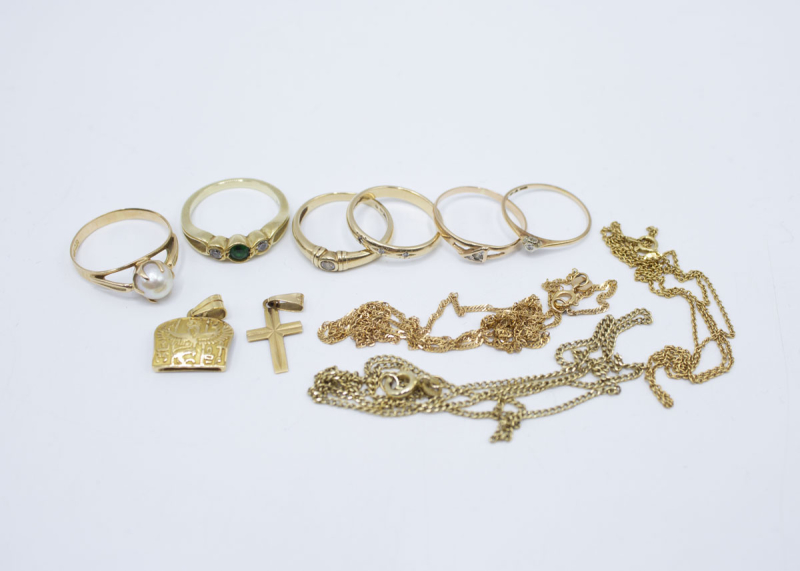 196: (15955-1) Erä kultaa 27,04g/750 br, 81,24g/585 br.