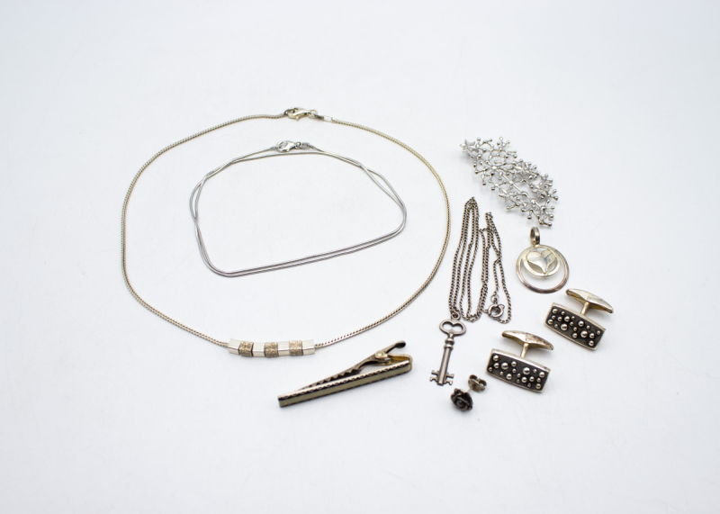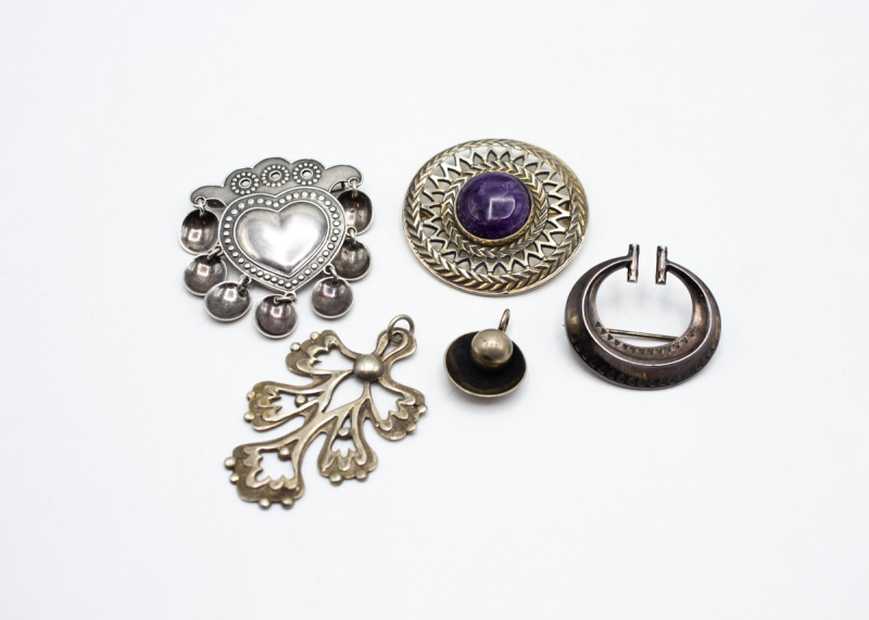 37: (16455-2) Erä rintaneuloja ja riipuksia Mm. Kalevala ja Seppo Tamminen 47,93g (925, 916, 813) br.